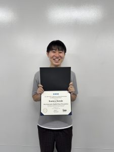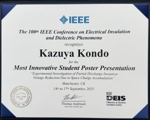 計測電機制御研究室の近藤一哉君(修士2年)が2025年9月14~18日に英国マンチェスター大学で開催されたThe 100th IEEE Conference on Electrical Insulation and Dielectric Phenomena (IEEE CEIDP 2025) -第100回電気絶縁及び誘電現象に関する国際会議(IEEE-DEIS主催)- にて研究成果を発表し、最も革新的な研究成果を発表した学生に授与される、”Most Innovative Student Presentation” を受賞しました。